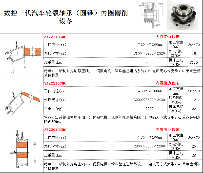 用途:磨削三代汽車輪轂軸承的內圈(圓錐) 特點: 1.砂輪軸為動靜壓軸; 2.伺服電機、滾珠絲杠進給系統; 3.電磁無心式支承; 4.單點金鋼筆凸度修整器。