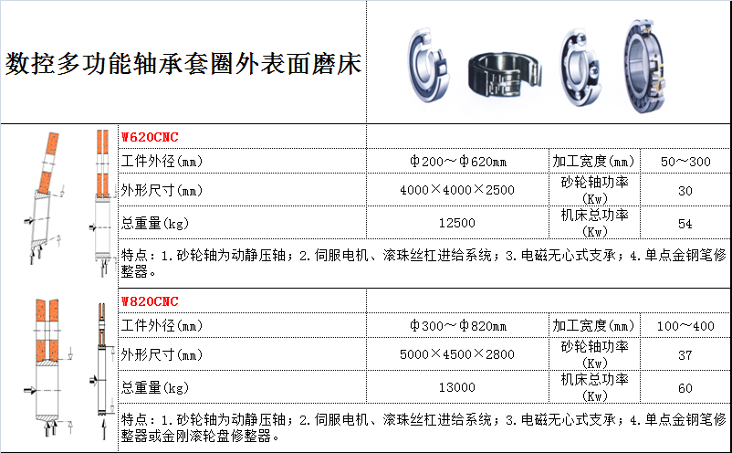 用途:磨削軸承套圈多種類型的外表面 特點: 1.砂輪軸為動靜壓軸; 2.伺服電機、滾珠絲杠進給系統; 3.電磁無心式支承; 4.單點金鋼筆修整器。