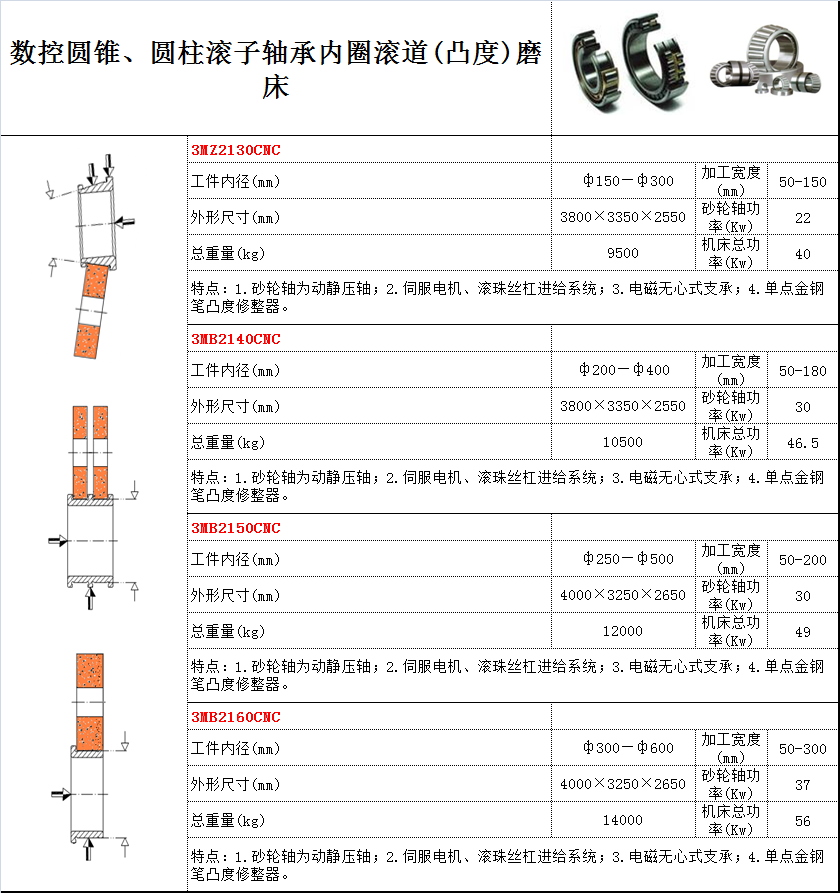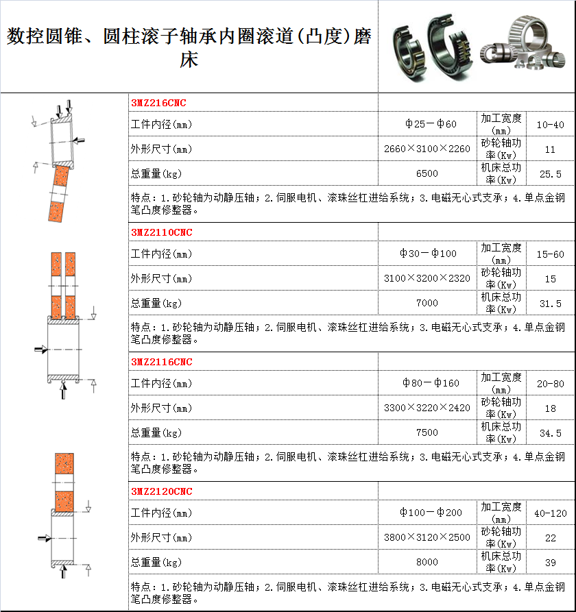 用途:磨削圓錐、圓柱滾子軸承內圈的滾道(凸度) 特點: 1.砂輪軸為動靜壓軸; 2.伺服電機、滾珠絲杠進給系統; 3.電磁無心式支承; 4.單點金鋼筆凸度修整器。