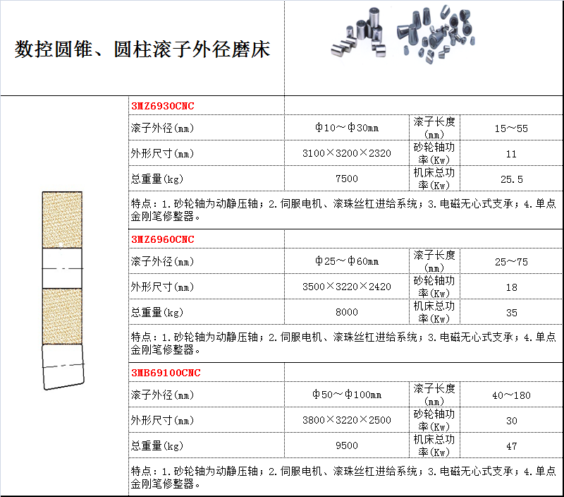 用途:磨削圓錐、圓柱滾子的外徑 特點: 1.砂輪軸為動靜壓軸; 2.伺服電機、滾珠絲杠進給系統; 3.電磁無心式支承; 4.單點金剛筆修整器。